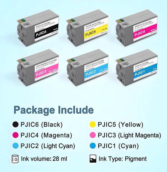 Package Contents: 1 x PJIC1 - C13S020447 (Cyan), 1 x PJIC2 - C13S020448(Light Cyan), 1 x PJIC3 - C13S020449(Light Magenta), 1 x PJIC4 - C13S020450(Magenta), 1 x PJIC5 - C13S020451(Yellow), 1 x PJIC6 - C13S020452(Black). There are a total of 6 28ml pigment ink cartridges