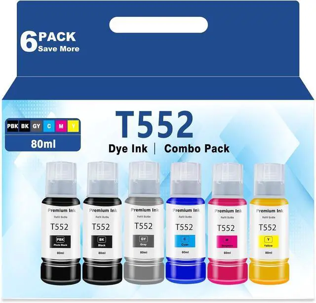 Comprehensive 6-Color Ink SetA full-spectrum refill kit containing 6-pack 80ml dye ink bottles: Black, Cyan, Magenta, Yellow, Photo Black, and Gray. Supports diverse printing demands, from vivid photo reproductions to crisp text documents, ensuring versatility for both creative and office projects.