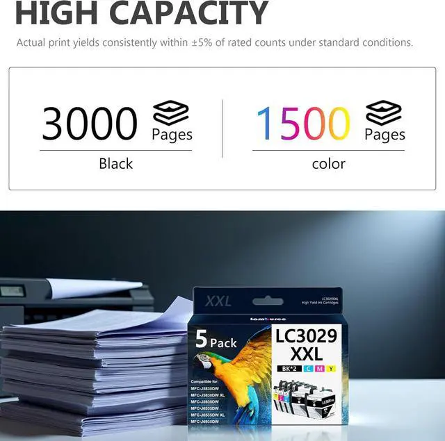 Includes: 5 Pack for LC3029 XXL ink cartridges(2 x Black, 1 x Cyan, 1 x Magenta, 1 x Yellow) for printers to perfect balance of efficiency & cost control