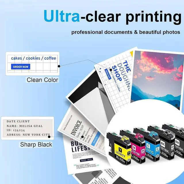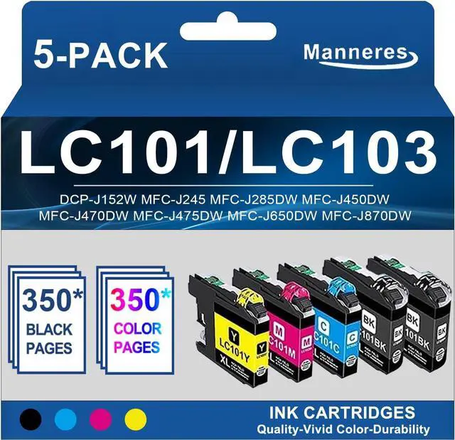 Complete 5-Pack Set - Full Color Printing: Your all-in-one solution for vibrant printing.This value pack includes: one each of High-Yield Cyan, Magenta and Yellow LC101/LC103 XL ink cartridges, 2 x Black LC101/LC103 XL ink cartridges. Ensuring you're ready for any printing task