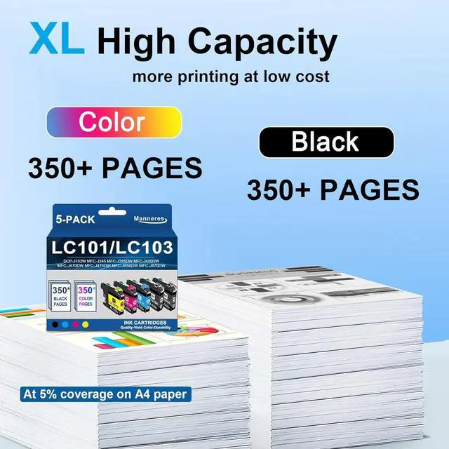 High Page Count - Low Cost: Each LC101/LC103 XL ink cartridges can output at least 350 pages, allowing you to achieve print quality comparable to the original at a low cost.These 5 packages offer a total of 1,750 pages, making them ideal for use in homes, offices and schools.(Letter/A4, 5% coverage)