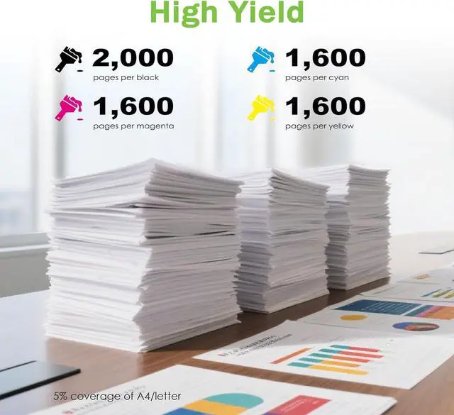 Impressive Page YieldAchieve up to 2,000 black pages and 1,600 color pages (A4, 5% coverage), reducing the frequency of cartridge replacements.