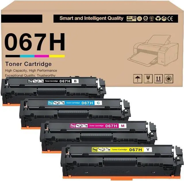 The packaging contains: 4 Color Compatible Toner Cartridge Replacement for Canon 067H Toner Cartridge (1 x 067H black toner, 1 x 067H cyan toner, 1 x 067H yellow toner, 1 x 067H magenta toner)