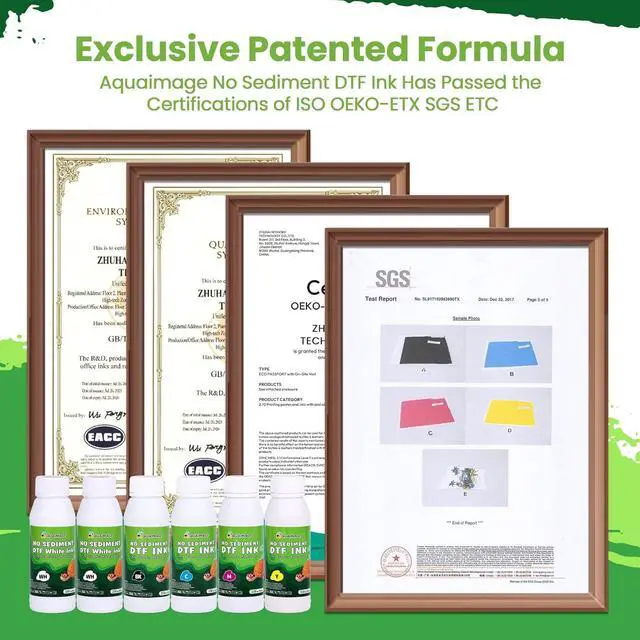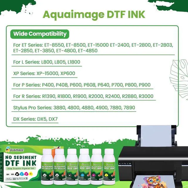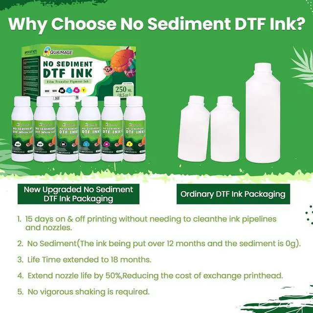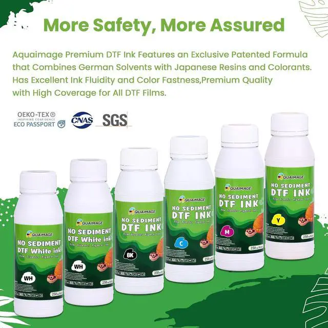 New Upgraded No Sediment DTF InkAquaimage DTF Ink features an exclusive patented formula that combines German solvents with Japanese resins and colorants.This unique formula allows the ink to be used for more than 12 months without any sedimentation.And has excellent ink fluidity and color fastness,Premium quality with high coverage for all DTF Films. Wide gamut, high color density and saturation. Washable and not easy to fade.