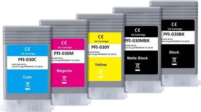 Package Content: 5Pack PFI-030 Ink Tank Set (1Matte Black, 1Black, 1Cyan, 1Magenta, 1Yellow), Capacity: 55ML each, total 275ML