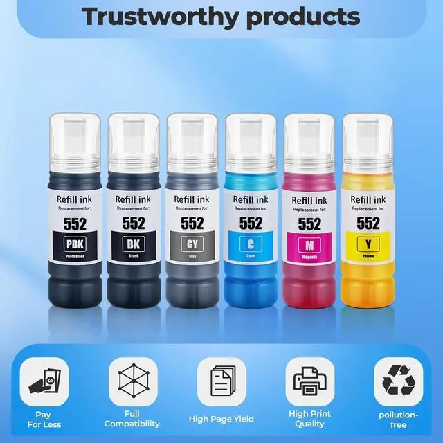 552 Ink Refill Bottles Extra-large capacity: compatible for 552 T552 ink refill bottles Works with ET-8550 ET-8500 ET 8550 ET8500 ET 8550 ET8500 Printer Approximately 9000 pages per 552 T552 black ink refill bottle, 8000 pages per 552 photo black/cyan/magenta/yellow/grey ink refill bottle (with 5% coverage of A4 paper).