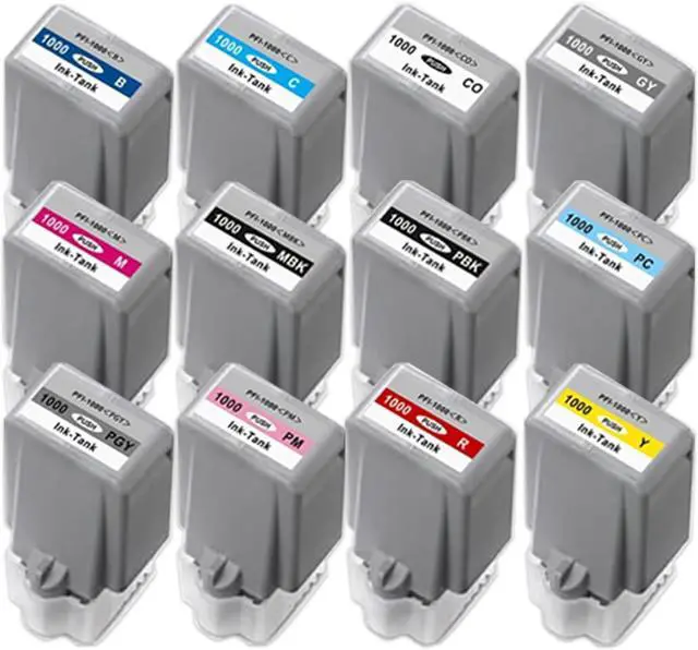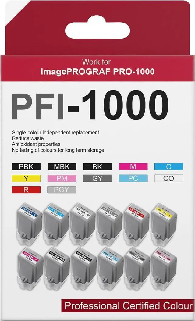 What's in the box: new PFI-1000 High-Yield Ink Cartridge 12-pack (Chroma Optimizer, Matte Black, Photo Black, Cyan, Magenta, Yellow, Photo Cyan, Photo Magenta, Gray, Photo Gray, Red, Blue)
