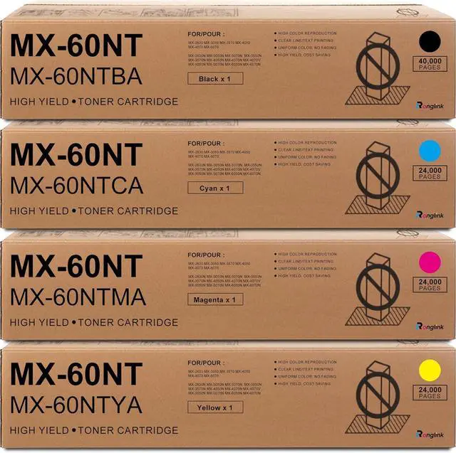 Package includes: 1 x MX-60NTBA black toner cartridge, 1 x MX-60NTCA cyan toner cartridge, 1 x MX-60NTMA magenta toner cartridge, 1 x MX-60NTYA yellow toner cartridge replacement for Sharp MX-60NT toner cartridge, MX60NT toner cartridge.