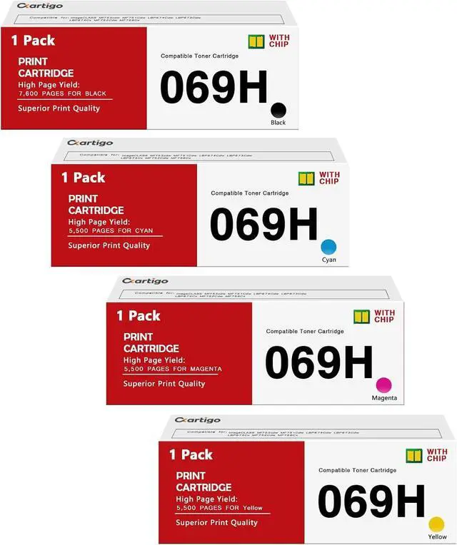 Package Contents: 4 Pack 069H Toner Cartridge Set replacement for Canon 069H 069 CRG-069H High Yield Toner Cartridge (1 x cartridge 069H Black toner, 1 x cartridge 069H Cyan toner, 1 x cartridge 069H Magenta toner, 1 x cartridge 069H Yellow toner)