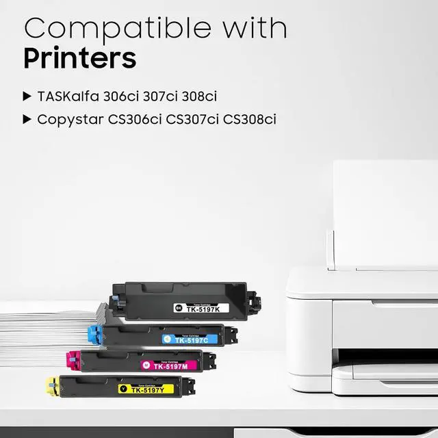 High Page Yield: TK-5197 TK5197 toner cartridge Up to 15,000 pages per black toner cartridge, 7,000 pages per color toner cartridge, Letter/A4 at 5% coverage