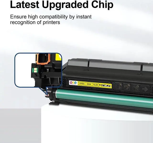 High Page Yield: 12,500 Pages Compatible for 655A black toner and 10,500 Pages per Color toner at 5% coverage (Letter/A4). The inbuilt chip can indicate the toner level left and you can arrange a new replacement when needed