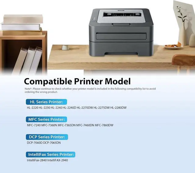 Compatible Printer Models : HL-2220 HL-2230 HL-2240 HL-2240D HL-2270DW HL-2275DW HL-2280DW MFC-7240 MFC-7360N MFC-7365DN MFC-7460DN MFC-7860DW DCP-7060D DCP-7065DN IntelliFax-2840 IntelliFAX-2940 Printer