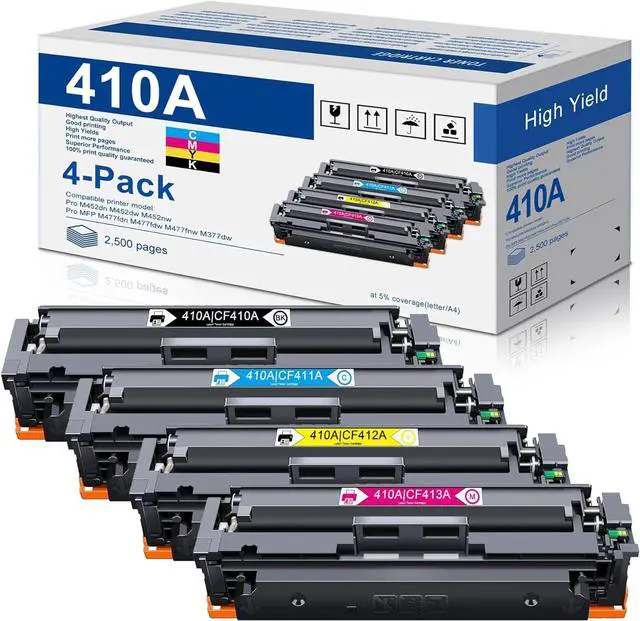Package Contents: 1 x 410A CF410A black toner, 1 x 410A CF411A cyan toner, 1 x 410A CF412A yellow toner, 1 x 410A CF413A magenta toner (Total 4 Pack)