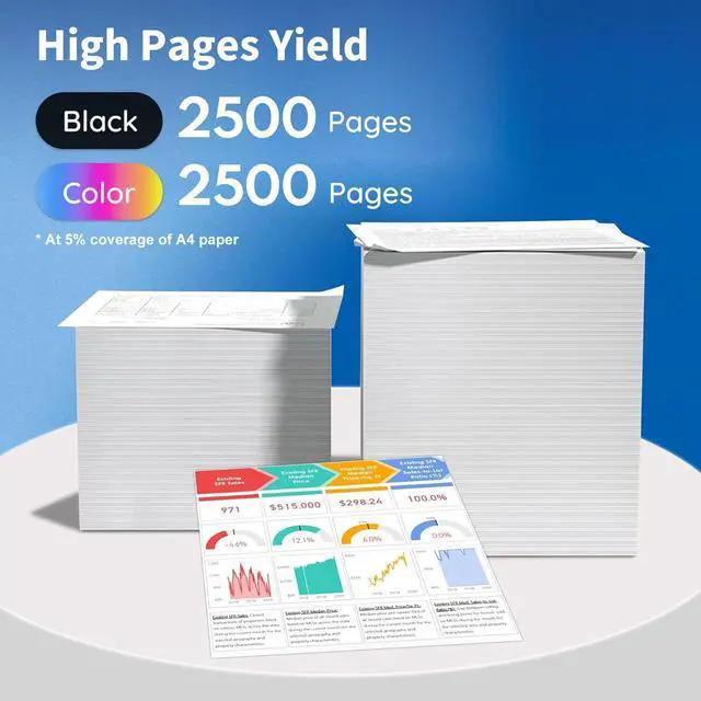 High Page Yield: Up to 2,500 pages per Black, 2,500 pages per Color cartridges at 5% coverage (Letter/A4)