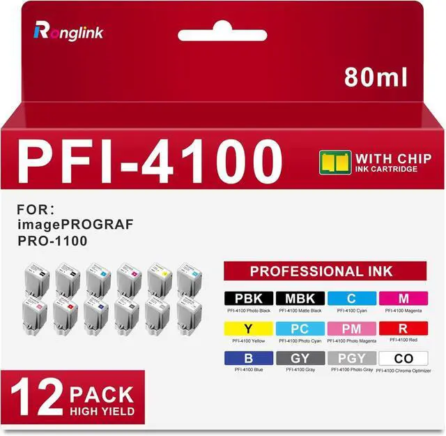 Package includes: 1 x PFI-4100MBK matte black, 1 x PFI-4100PBK photo black, 1 x PFI-4100C cyan, 1 x PFI-4100Y yellow, 1 x PFI-4100M magenta, 1 x PFI-4100CO chroma optimizer, 1 x PFI-4100PC photo cyan, 1 x PFI-4100PM photo magenta, 1 x PFI-4100R red, 1 x PFI-4100BL blue, 1 x PFI-4100GY gray, 1 x PFI-4100PGY photo gray replacement for Canon PFI-4100 ink, PFI4100 ink.