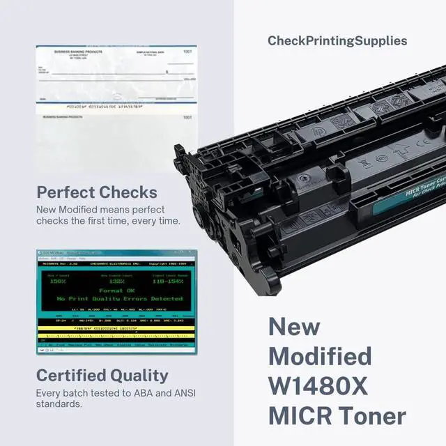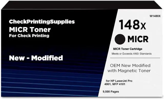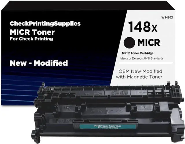 NEW MODIFIED - MICR Toner added to Genuine New W1480X Cartridge. Using a new modified cartridge insures that there will be no problems with quality or compatibility.