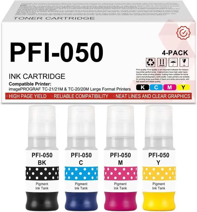 Package Contents: PFI-050 Ink Bottle 4 Pack (Black, Cyan, Magenta, Yellow)
