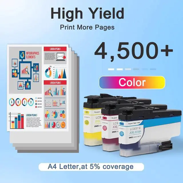 High Page Yield: Up to 1,500 pages per LC3037 XXL C/M/Y Ink Cartridges (Letter/A4, at 5% coverage)