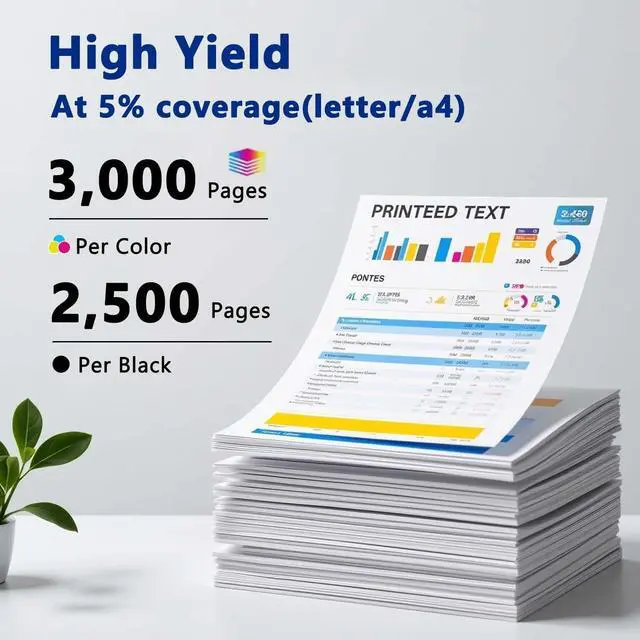 • High Page Yiled: 2,500 pages per Black cartridge and 3,000 pages per Cyan Yellow Magenta Cartridge at 5% coverage (Letter/A4)