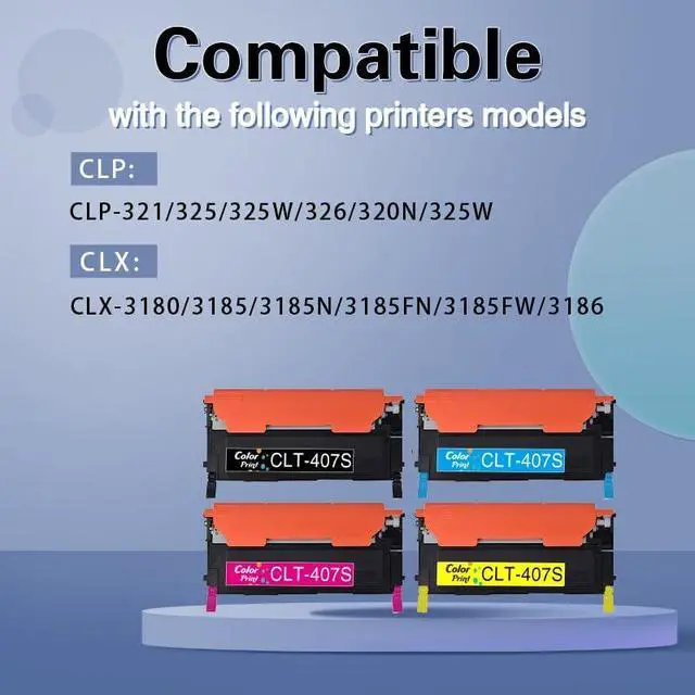 Package Contents: 5-Pack CLT-407S CLT407S 407S Toner Cartridge CLP325 (2 Black, 1 Cyan, 1 Magenta, 1 Yellow)