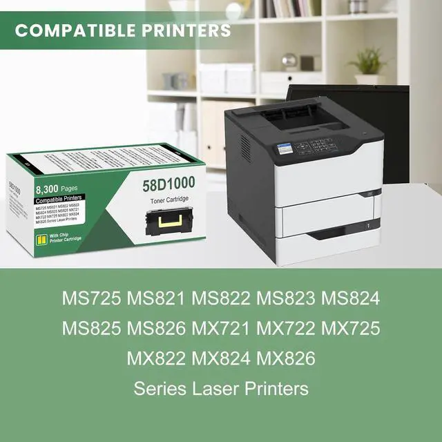 Compatible List: Compatible for Lexmark 58D1000 Black toner cartridge replacement for Lexmark MS725dvn MS821dn MS821n MS822de MS823dn MS823n MS824de MS825dn MS826de MX721ade MX721adhe MX722ade MX722adhe MX725dvn MX822ade MX822adxe MX824ade MX824adxe MX826ade MX826adxe Printers