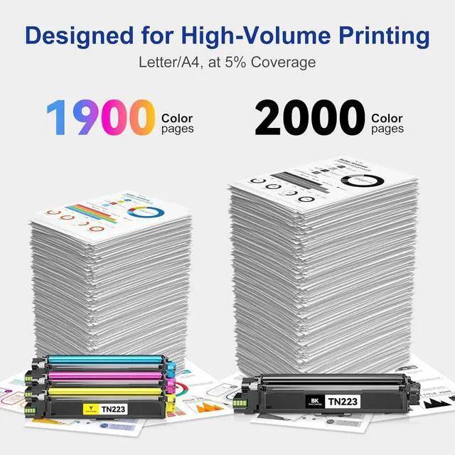 High Yield (approx.): TN223BK black toner prints 2000 pages, TN223 C/M/Y each colour toner prints 1900 pages, coverage rate of 5% (letter/A4)