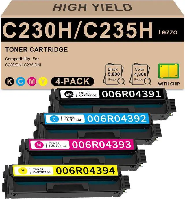 Products in the package: 4 Pack C230 C235 C230H C235H High Capacity Toner Cartridges, 1x Black 006R04391 Toner,1x Cyan 006R04392 Toner,1x Yellow 006R04394 Toner,1x Magenta 006R04393 Toner