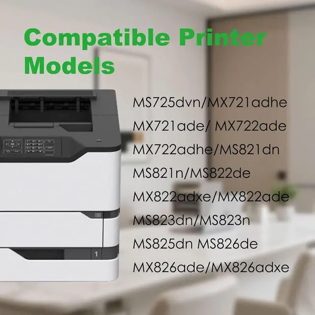 Compatible Printers: MS821dn, MS821n,MS822de, MS823dn, MS823n, MS824de, MS825dn, MS826de, MX721ade, MX721adhe, MX722ade, MX722adhe, MX725dvn, MX822ade, MX822adxe, MX824ade, MX824adxe, MX826ade, MX826adxe