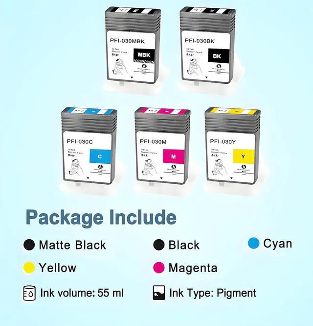 Package Include: Consists of 5 PFI-030 cartridges (Matte Black, Black, Cyan, Magenta, Yellow), Each bottle contains 55ml pigment ink with chip