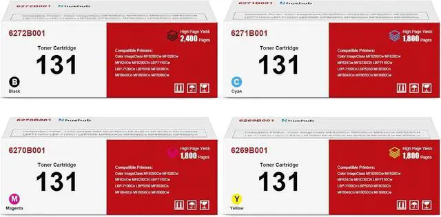 Package Contents: 1 x Black 6272B001, 1 x Cyan 6271B001, 1 x Yellow 6269B001, 1 x Magenta 6270B001, 4 Pack CRG-131 Toner Cartridge