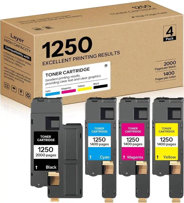 Product packaging content: 4 Pack Compatible Dell 1250 Toner Cartridge( 1 x Dell 3K9XM/331-0778 Black, 1 x Dell FYFKF/331-0777 Cyan, 1 x Dell DG1TR/331-0779 Yellow, 1 x Dell 5GDTC/331-0780 Magenta Toner Cartridge)