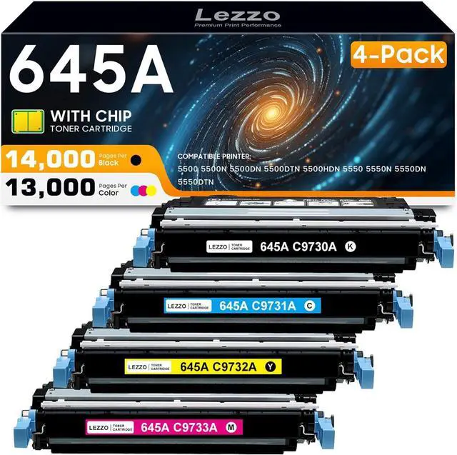 Products in the package: 645A Toner Cartridge 4 Pack, 1x Black 645A C9730A Toner Cartridge,1x Cyan 645A C9731A Toner Cartridge,1x Yellow 645A C9732A Toner Cartridge,1x Magenta 645A C9733A Toner Cartridge