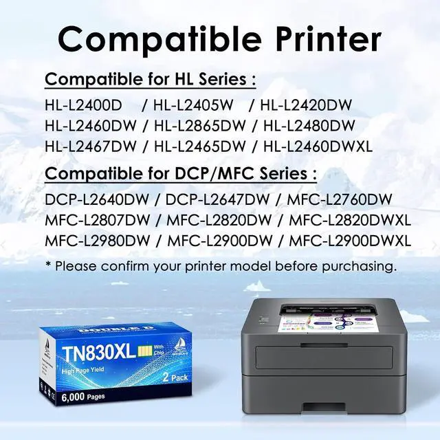 Compatible Printers Compatible With Brother HL-L2405W, HL-L2420DW, HL-L2460DW, HL-L2460DWXL, HL-L2465DW, HL-L2467DW, HL-L2480DW, HL-L2865DW, MFC-L2760DW, MFC-L2807DW, MFC-L2820DW, MFC-L2820DWXL, MFC-L2900DW, MFC-L2900DWXL, MFC-L2980DW, DCP-L2640DW, DCP-L2647DW, HL-L2400D Printer
