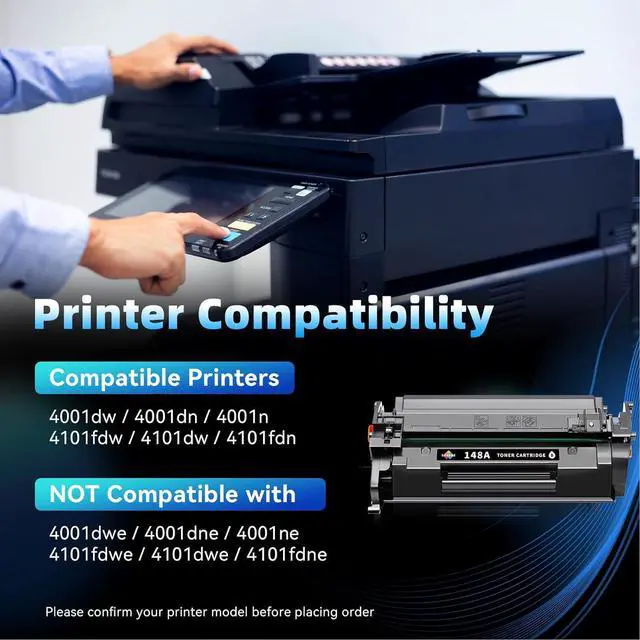Printer Compatibility: HP 4001dw 4001dn 4001n 4101fdw 4101dw 4101fdn printer, NOTE: NOT COMPATIBLE WITH 4001dwe 4001dne 4001ne 4101fdwe 4101dwe 4101fdne