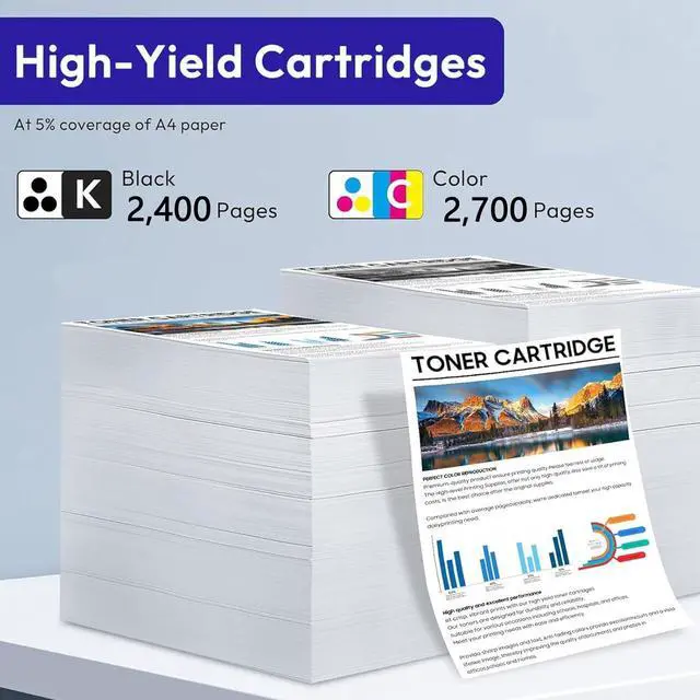 High Yield & Cost-SavingEach black toner cartridge offers up to 2400 pages of printing, and each color ink cartridge (cyan, magenta, yellow) provides up to 2700 pages. Premium remanufactured design cuts OEM costs by 50% without sacrificing qualityideal for home office and small business high-volume printing.