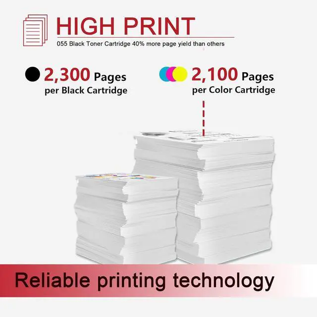 Page Yield: Up to 2,300 pages per 055 black toner and up to 2,100 pages per 055 color toner at 5% coverage (Letter/A4)