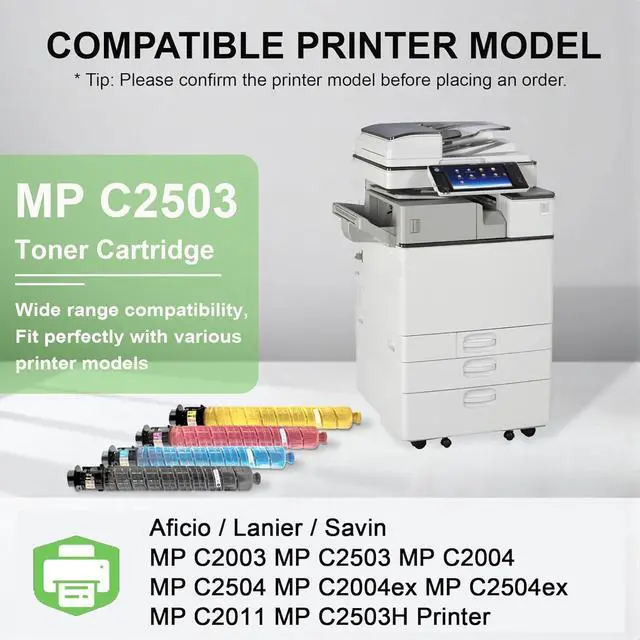 Compatible Printers for MP C2003 MP C2503 Toner Cartridge: Aficio / Lanier / Savin MP C2003 MP C2503 MP C2004 MP C2004ex MP C2504 MP C2504ex MP C2011 MP C2503H Printer