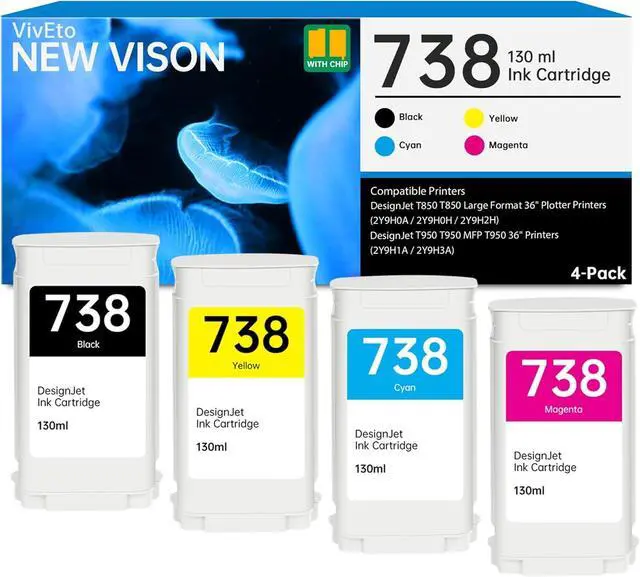 Compatible List: Compatible for HP Design Jet 738 ink replacement for HP DesignJet T850 DesignJet T850 Large Format 36" Plotter Printers (2Y9H0A / 2Y9H0H / 2Y9H2H) DesignJet T950 T950MFP Printers DesignJet T950 36" Printers (2Y9H1A / 2Y9H3A)