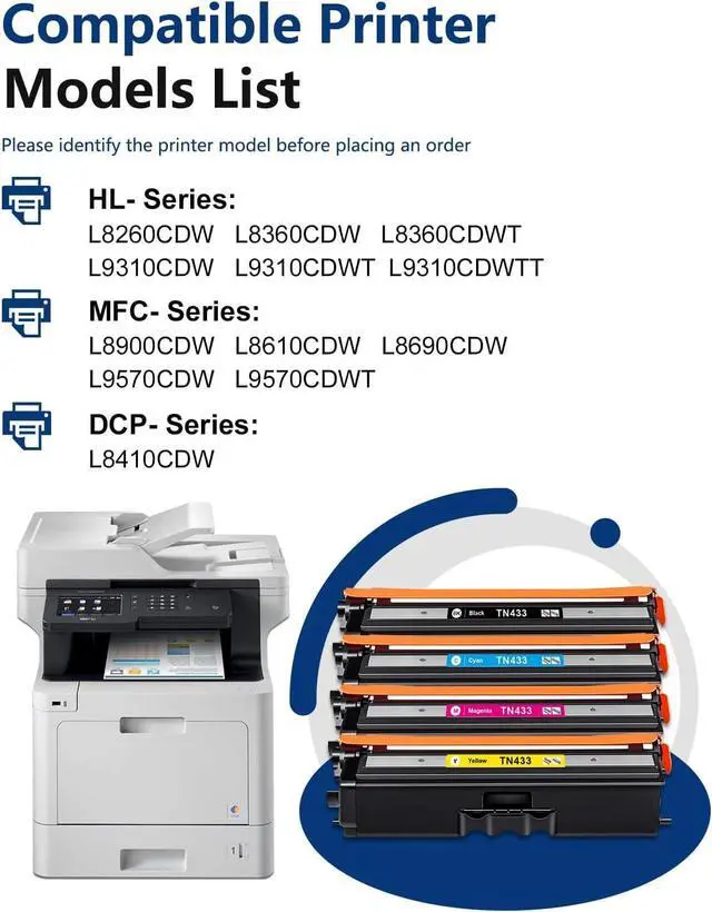 Compatible Printers: TN-433 Toner Cartridge Compatible with MFC-L8610CDW, MFC-L8900CDW, MFC-L8690CDW, MFC-L9570CDW, MFC-L9570CDWT, HL-L8260CDW, HL-L8360CDW, HL-L8360CDWT, HL-L9310CDW, HL-L9310CDWT, HL-L9310CDWTT, DCP-L8410CDW Printer