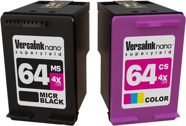 Use VersaInk-nano 64 MS MICR Black Ink Cartridges in your inkjet printer to generate 100% bank compliant checks and VersaInk-nano 64 CS Tri-color ink cartridges contain cyan, yellow and magenta ink to produce bright, vibrant color. The bank code line on the bottom of every check is required to be printed with magnetic (MICR) ink to be readable by Magnetic Ink Character Recognition devises (MICR check readers) used at retail and financial outlets everywhere.