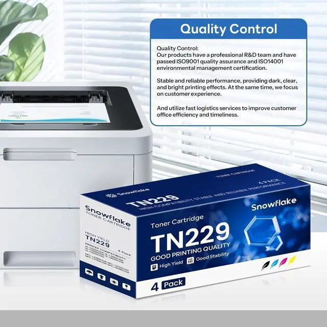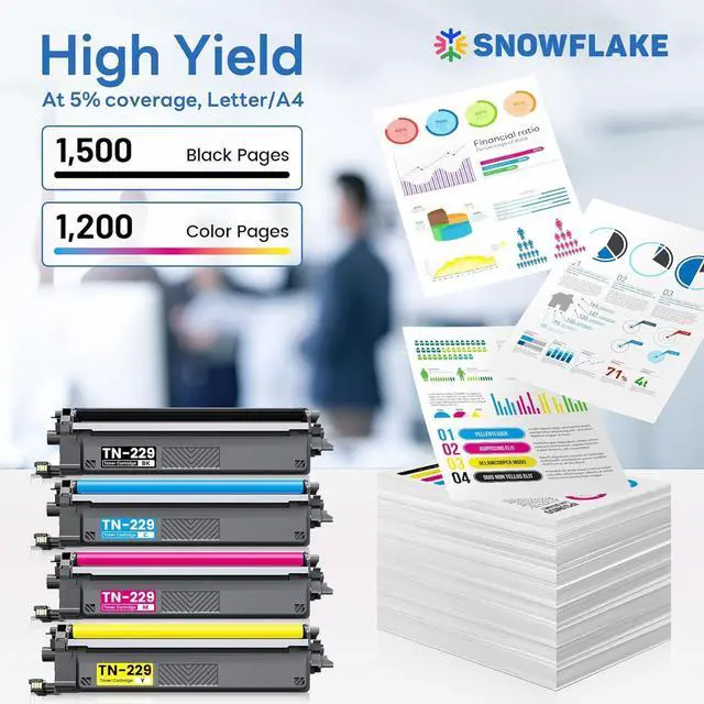 High Yield : Up to 1500 pages per TN229 Black Toner Cartridge & 1200 pages per TN229 Color Toner Cartridge (at 5% coverage, Letter/A4).