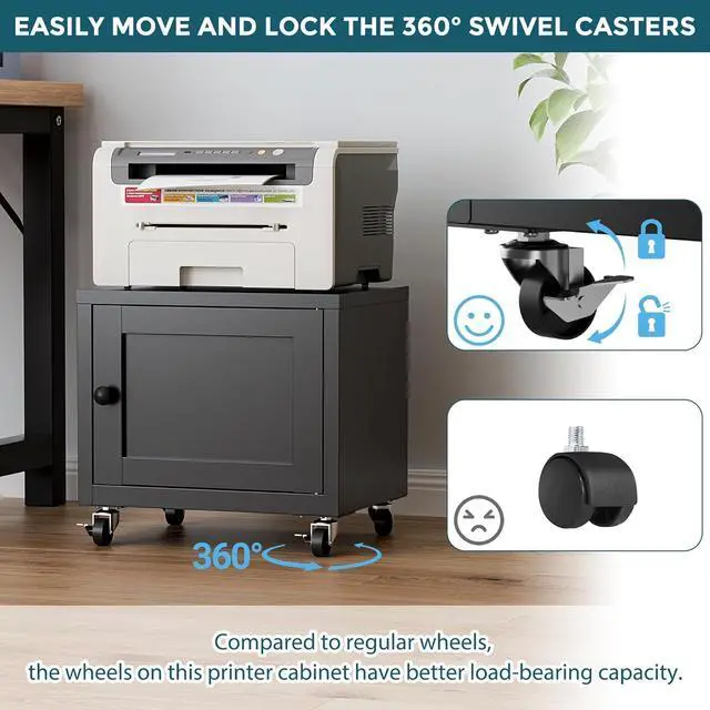 [Flexible Mobility & Stable Locking]: Equipped with 4 360° rotating casters, this printer stand glides easily across both smooth wooden floors and carpeted surfaces (even those with resistance). Once moved to your desired location, simply lock the 2 front casters to secure the cabinet firmly in place.