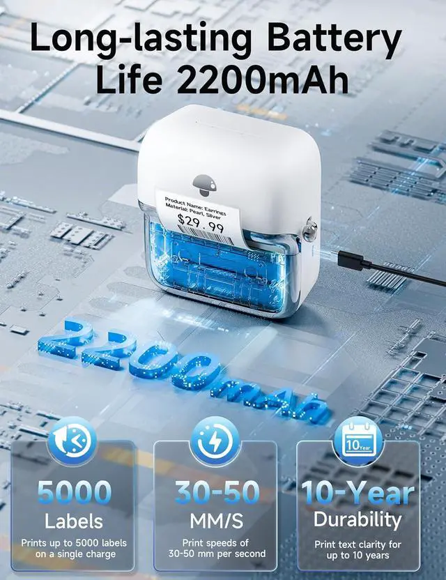 2025 Upgraded Version - Phomemo M250 Label Maker: With an extended battery life of 2200mAh, the Phomemo M250 portable label printer can print up to 5000 labels on a single charge. Enjoy a printing speed of 30-50mm per second. It features an automatic sleep mode that conserves energy by automatically shutting down after 5 minutes of inactivity, preventing unnecessary power waste