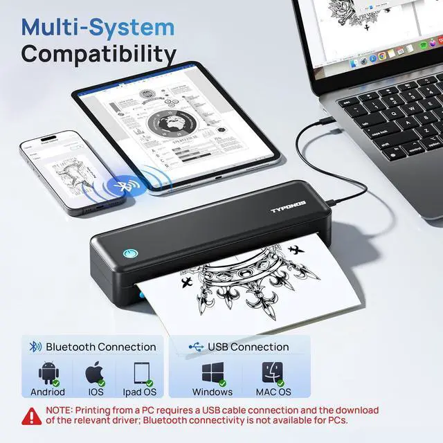 Multi-Format Support: Our wireless printer accommodates 8.5" x 11" thermal paper, portable printer handles multiple file formats. Once connected, our Bluetooth printer recognizes various document types. The compact device prints Word documents, Excel sheets, and PDF files with printed with this small printer. As a wireless tattoo stencil printer, it also processes image files, accurately reproducing complex patterns impresora portátil