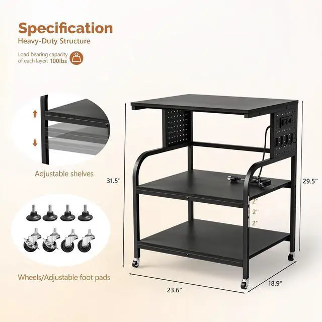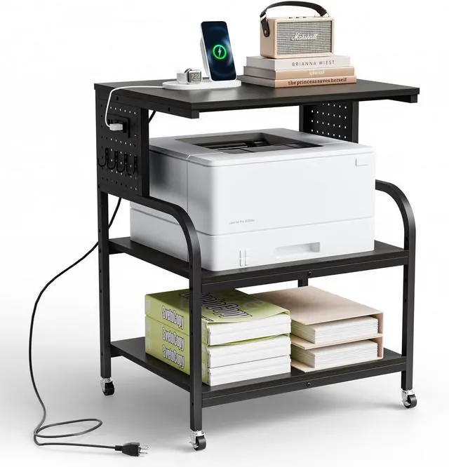 Convenient Power StripThis VINGLI Printer Cart is equipped with a power strip that includes 2 AC outlets, 2 USB ports, and a 5 FT power cord. It provides easy access to power for your printer and other devices.