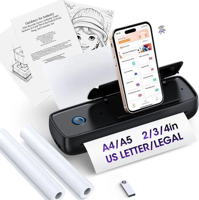 Inkless Portable Printer Wireless for Travel - High Resolution, 3800mAh Battery, Thermal Mini for A4/A5/US Letter, Bluetooth & USB, Lightweight Wireless Printer for Home/Office