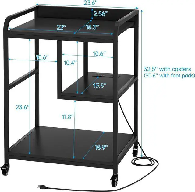 Printer Stand with Power OutletsThis printer stand is equipped with a convenient power hub that includes 2 AC outlets, 2 USB ports, and 1 TYPE C port, allowing you to power your printer and charge multiple devices simultaneously all from one sleek and organized stand. Moreover, the power cord is as long as 6.5FT, providing flexibility and convenience in setting up your workspace. Say goodbye to tangled cords and messy outlets - with our printer stand, you can maintain a neat and organized workspace while enjoying the convenience of easy access to power.