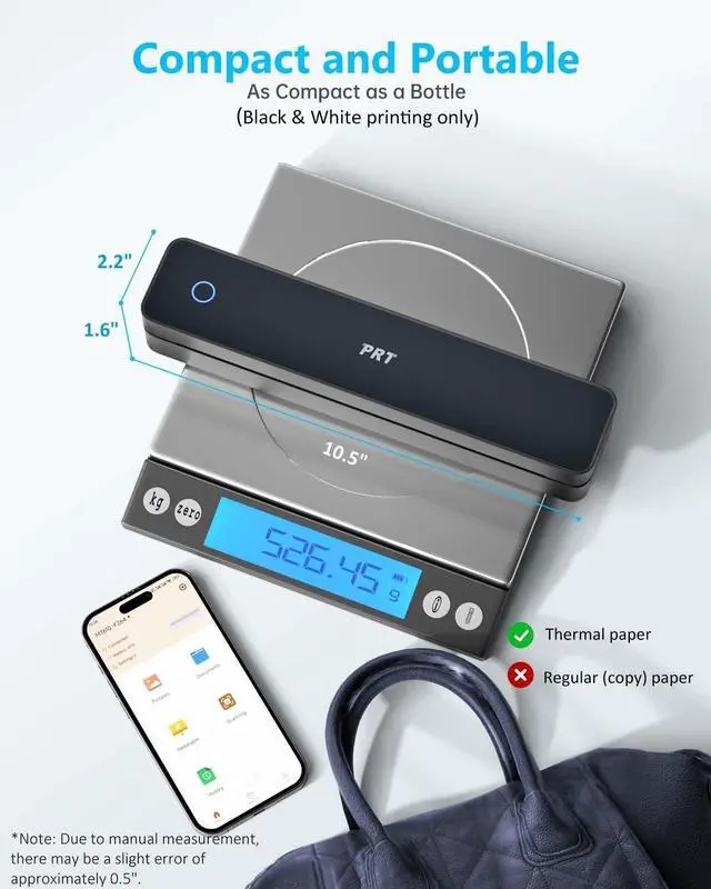 Ultra-Portable Compact Printer for TravelMeasuring just 10.5" x 2.2" x 1.6" and weighing only 1.1lb, this portable thermal printer fits easily into any backpack, laptop bag, or car compartment.A true travel printer designed for mobility, it pairs seamlessly with the free, powerful HerePrint app (iOS/Android) for fast, intuitive on-the-go printing..(Black & White printing only.)