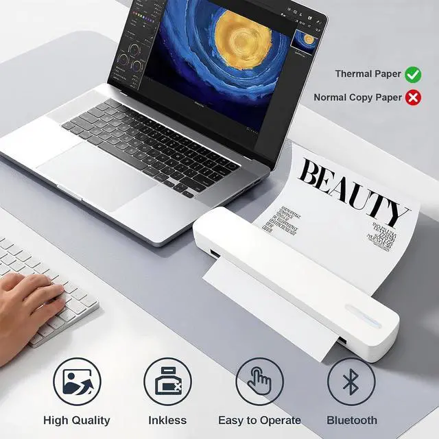 Cost-Effective & Inkless Printer - This Bluetooth mobile printer utilizes advanced thermal technology, eliminating the need for ink, toner, or ribbons during operation. It effectively avoids common issues like clogs and tedious cleaning. Note: This printer is compatible exclusively with thermal paper (not suitable for standard copy paper) and supports black-and-white printing only.