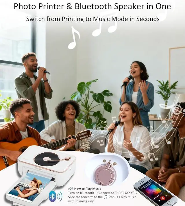 • The Perfect Gift Desktop Photo PrinterSearching for an unforgettable gift? Choose this charming desktop photo printer! Designed like a retro record player, this device is instantly appealing. It's perfectly sized, plug and play, and prints high-quality, 300DPI photos effortlessly. Its unique ability to also act as a Bluetooth speaker and play personalized voice messages makes it a thoughtful, versatile present that stands out from a typical gadget.